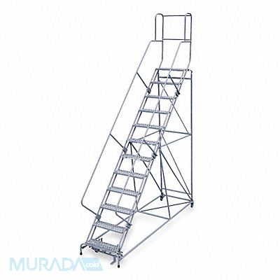 Rolling Ladder Material Steel Platform Height 120 in Handrails Included Yes Handrail Height 42 in Overall Height 162 in Number of Steps 12 Unassembled Load Capacity 800 lb Step Tread Perforated Platform Depth 12 in Platform Width 24 in Bottom Width 32 in Base Depth 116 in Overall Width 32 in Climbing Angle 50 Degrees Step Depth 7 in Step Width 24 in Ladder Actuation Foot Activated Step Lock Finish Powder Coated Color Gray Standards ANSI OSHA Rear Exit No