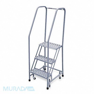 Rolling Ladder Material Steel Platform Height 30 in Handrails Included Yes Handrail Height 30 in Overall Height 60 in Number of Steps 3 Assembled Load Capacity 450 lb Step Tread Perforated Platform Depth 10 in Platform Width 16 in Bottom Width 20 in Base Depth 26 in Overall Width 20 in Climbing Angle 59 Degrees Step Depth 7 in Step Width 16 in Ladder Actuation Weight Activated Step Lock Finish Powder Coated Color Gray Standards ANSI OSHA Rear Exit No
