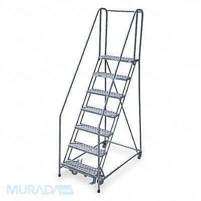 Rolling Ladder Material Steel Platform Height 70 in Handrails Included Yes Handrail Height 30 in Overall Height 100 in Number of Steps 7 Assembled Load Capacity 450 lb Step Tread Perforated Platform Depth 10 in Platform Width 24 in Bottom Width 30 in Base Depth 53 in Overall Width 30 in Climbing Angle 59 Degrees Step Depth 7 in Step Width 24 in Ladder Actuation Foot Activated Step Lock Finish Powder Coated Color Gray Standards ANSI OSHA Rear Exit No