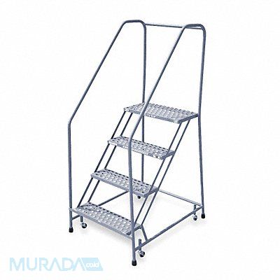 Rolling Ladder Material Steel Platform Height 40 in Handrails Included Yes Handrail Height 30 in Overall Height 70 in Number of Steps 4 Assembled Load Capacity 450 lb Step Tread Perforated Platform Depth 12 in Platform Width 24 in Bottom Width 30 in Base Depth 40 in Overall Width 30 in Climbing Angle 50 Degrees Step Depth 7 in Step Width 24 in Ladder Actuation Weight Activated Step Lock Finish Powder Coated Color Gray Standards ANSI OSHA Rear Exit No