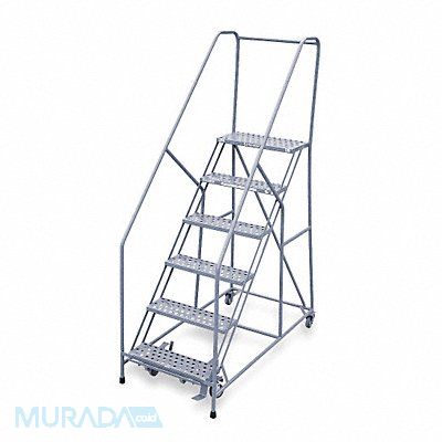 Rolling Ladder Material Steel Platform Height 60 in Handrails Included Yes Handrail Height 30 in Overall Height 90 in Number of Steps 6 Assembled Load Capacity 450 lb Step Tread Perforated Platform Depth 12 in Platform Width 24 in Bottom Width 30 in Base Depth 60 in Overall Width 30 in Climbing Angle 50 Degrees Step Depth 7 in Step Width 24 in Ladder Actuation Foot Activated Step Lock Finish Powder Coated Color Gray Standards ANSI OSHA Rear Exit No