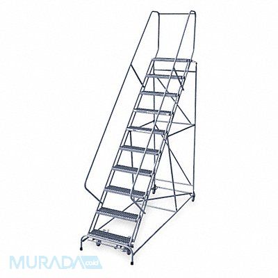 Rolling Ladder Material Steel Platform Height 100 in Handrails Included Yes Handrail Height 30 in Overall Height 130 in Number of Steps 10 Assembled Load Capacity 450 lb Step Tread Serrated Platform Depth 12 in Platform Width 24 in Bottom Width 32 in Base Depth 97 in Overall Width 32 in Climbing Angle 50 Degrees Step Depth 7 in Step Width 24 in Ladder Actuation Foot Activated Step Lock Finish Powder Coated Color Gray Standards ANSI OSHA Rear Exit No
