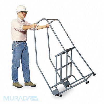 Tilt and Roll Ladder Material Steel Platform Height 30 in Handrails Included Yes Handrail Height 30 in Overall Height 60 in Number of Steps 3 Assembled Load Capacity 450 lb Step Tread Perforated Platform Depth 10 in Platform Width 24 in Bottom Width 28 in Base Depth 30 in Overall Width 28 in Climbing Angle 59 Degrees Step Depth 7 in Step Width 24 in Ladder Actuation None Finish Powder Coated Color Gray Standards ANSI OSHA Includes 2-1/2 in Rubber Pads Rear Exit No