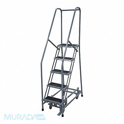 Rolling Ladder Material Steel Platform Height 50 in Handrails Included Yes Handrail Height 30 in Overall Height 80 in Number of Steps 5 Assembled Load Capacity 450 lb Step Tread Antislip Vinyl Platform Depth 10 in Platform Width 16 in Bottom Width 20 in Base Depth 40 in Overall Width 20 in Climbing Angle 59 Degrees Step Depth 7 in Step Width 16 in Ladder Actuation Foot Activated Step Lock Finish Powder Coated Color Gray Standards ANSI OSHA Rear Exit No