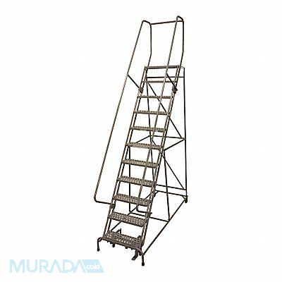 Rolling Ladder Material Steel Platform Height 110 in Handrails Included Yes Handrail Height 30 in Overall Height 140 in Number of Steps 11 Unassembled Load Capacity 450 lb Step Tread Antislip Vinyl Platform Depth 10 in Platform Width 24 in Bottom Width 32 in Base Depth 156 in Overall Width 32 in Climbing Angle 59 Degrees Step Depth 7 in Step Width 24 in Ladder Actuation Foot Activated Step Lock Finish Powder Coated Color Gray Standards ANSI OSHA Rear Exit No