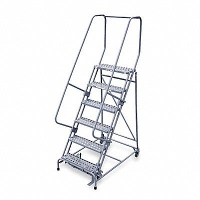 Rolling Ladder Material Steel Platform Height 60 in Handrails Included Yes Handrail Height 30 in Overall Height 90 in Number of Steps 6 Unassembled Load Capacity 450 lb Step Tread Serrated Platform Depth 10 in Platform Width 24 in Bottom Width 30 in Base Depth 46 in Overall Width 30 in Climbing Angle 59 Degrees Step Depth 7 in Step Width 24 in Ladder Actuation Foot Activated Step Lock Finish Powder Coated Color Gray Standards ANSI OSHA Includes Crutch Tips Rear Exit No