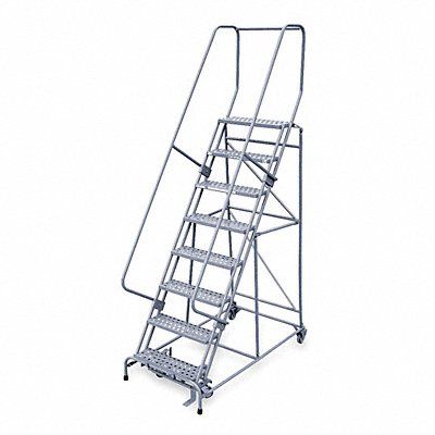 Rolling Ladder Material Steel Platform Height 80 in Handrails Included Yes Handrail Height 30 in Overall Height 110 in Number of Steps 8 Unassembled Load Capacity 450 lb Step Tread Serrated Platform Depth 10 in Platform Width 24 in Bottom Width 32 in Base Depth 58 in Overall Width 32 in Climbing Angle 59 Degrees Step Depth 7 in Step Width 24 in Ladder Actuation Foot Activated Step Lock Finish Powder Coated Color Gray Standards ANSI OSHA Includes Crutch Tips Rear Exit No