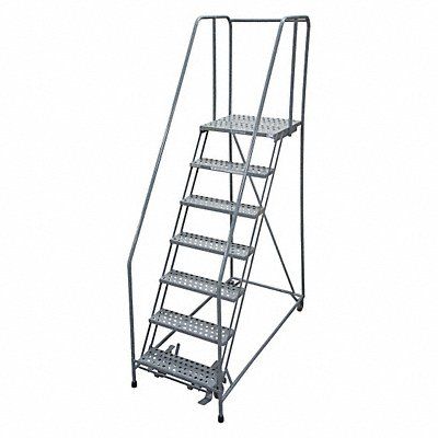 Rolling Ladder Material Steel Platform Height 70 in Handrails Included Yes Handrail Height 30 in Overall Height 100 in Number of Steps 7 Assembled Load Capacity 450 lb Step Tread Perforated Platform Depth 20 in Platform Width 24 in Bottom Width 30 in Base Depth 63 in Overall Width 30 in Climbing Angle 59 Degrees Step Depth 7 in Step Width 24 in Ladder Actuation Foot Activated Step Lock Finish Powder Coated Color Gray Standards ANSI OSHA Includes Crutch Tips Rear Exit No