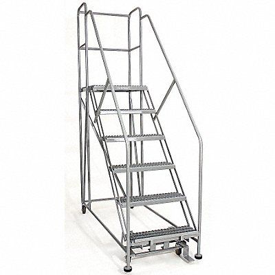 Single Access Rolling Platform Material Steel Platform Style Single Access Platform Height 70 in Load Capacity 800 lb Base Depth 87 in Bottom Width 28 in Platform Depth 36 in Platform Width 24 in Overall Height 8 ft 10 in Handrail Height 36 in Number of Guard Rails 3 Number of Legs 2 Number of Steps 7 Step Width 24 in Step Depth 7 in Climbing Angle 50 Degrees Step Tread Serrated Color Gray Finish Powder Coated Standards OSHA 1910.29 and ANSI A14.7