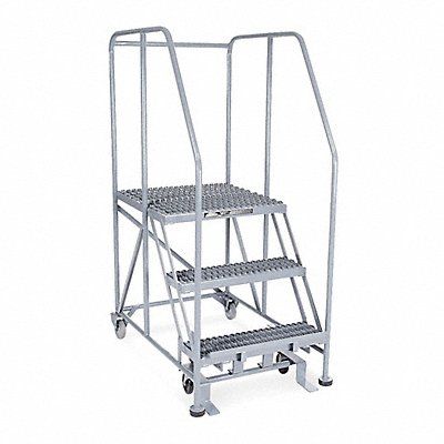 Single Access Rolling Platform Material Steel Platform Style Single Access Platform Height 30 in Load Capacity 800 lb Base Depth 43 in Bottom Width 28 in Platform Depth 24 in Platform Width 24 in Overall Height 5 ft Handrail Height 30 in Number of Guard Rails 3 Number of Legs 2 Number of Steps 3 Step Width 24 in Step Depth 7 in Climbing Angle 50 Degrees Step Tread Serrated Color Gray Finish Powder Coated Standards OSHA 1910.29 and ANSI A14.7 Includes 2-1/2 in Rubber Pads