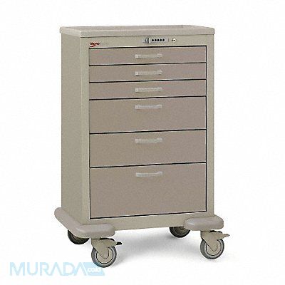 General Medical Supply Cart with Drawers Assembled/Unassembled Assembled Material Polymer Steel Load Capacity 600 lb Caster Wheel Dia 5 in Caster Wheel/Tread Material Polyurethane Caster/Wheel Configuration (2) Swivel (2) Swivel with Brake Caster Brake Type Face Contact Brake Cabinet Color Taupe Drawer Color Dark Tan Number of Drawers 6 Number of Shelves 1