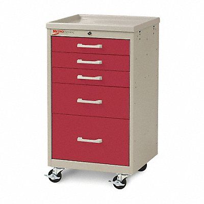 Compact General Medical Supply Cart with Drawers Assembled/Unassembled Assembled Material Polymer Steel Load Capacity 175 lb Caster Wheel Dia 3 in Caster/Wheel Configuration (2) Swivel (2) Swivel with Brake Caster Brake Type Side Pedal Brake Cabinet Color Taupe Drawer Color Red Number of Drawers 5 Number of Shelves 1 Shelf Length 19 7/8 in Shelf Width 17 3/4 in