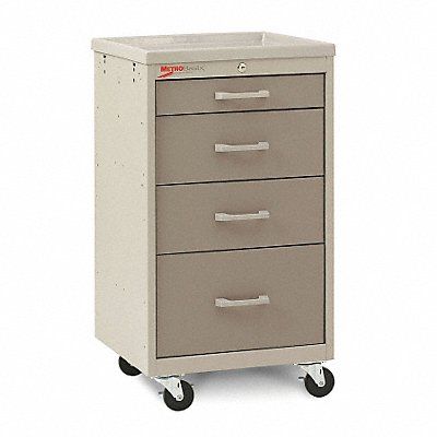 Compact General Medical Supply Cart with Drawers Assembled/Unassembled Assembled Material Polymer Steel Load Capacity 175 lb Caster Wheel Dia 3 in Caster/Wheel Configuration (2) Swivel (2) Swivel with Brake Caster Brake Type Side Pedal Brake Cabinet Color Taupe Drawer Color Dark Tan Number of Drawers 4 Number of Shelves 1 Shelf Length 19 7/8 in Shelf Width 17 3/4 in