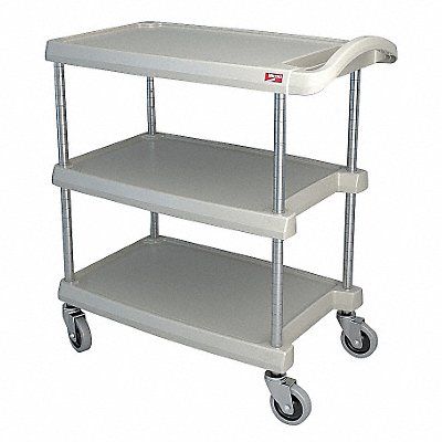 Utility Cart with Lipped Plastic Shelves Number of Shelves 3 Lip Style 4-Sided Lipped Load Capacity 400 lb Shelf Length 28 5/16 in Shelf Width 18 1/4 in Top Shelf Height 35 3/4 in Distance Between Shelves 11 in Distance Between Top and Middle Shelf 11 in Distance Between Middle and Bottom Shelf 11 in Handle Type Flat Handle Height 35 1/2 in Caster Brake Type No Brake Included Caster Wheel/Tread Material Thermoplastic Rubber Caster Wheel Dia 4 in