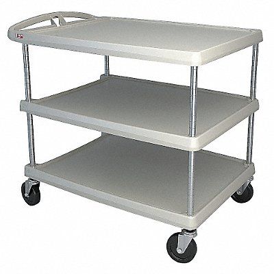 Utility Cart with Lipped Plastic Shelves Number of Shelves 3 Lip Style 4-Sided Lipped Load Capacity 500 lb Shelf Length 37 in Shelf Width 27 5/8 in Top Shelf Height 36 5/8 in Distance Between Shelves 11 in Distance Between Top and Middle Shelf 11 in Distance Between Middle and Bottom Shelf 11 in Handle Type Flat Handle Height 35 1/2 in Caster Wheel/Tread Material Rubber Caster Wheel Dia 5 in Caster/Wheel Configuration (4) Swivel Lip Height 3/8 in