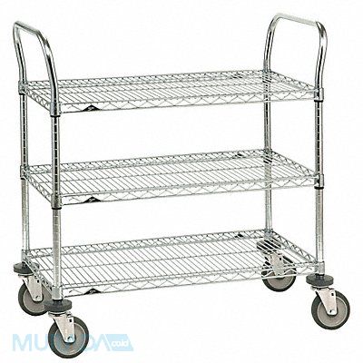 Utility Cart with Shallow Lipped Wire Shelves Load Capacity 600 lb Number of Shelves 3 Shelf Width 18 in Shelf Length 36 in Material Steel Finish Chrome Caster Wheel Dia 5 in Color Silver Caster Brake Type No Brake Included Caster Wheel/Tread Material Rubber Caster/Wheel Configuration (4) Swivel Handle Type (2) Raised Lip Style 4-Sided Lipped Shelf Orientation Flat Collapsible No Overall Height 39 in Overall Length 36 in Overall Width 18 in