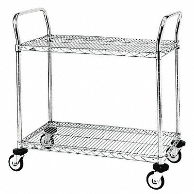 Utility Cart with Shallow Lipped Wire Shelves Load Capacity 375 lb Number of Shelves 2 Shelf Width 18 in Shelf Length 24 in Material Steel Finish Chrome Caster Wheel Dia 4 in Color Silver Caster Brake Type No Brake Included Caster Wheel/Tread Material Rubber Caster/Wheel Configuration (4) Swivel Distance Between Shelves 21 in Handle Type (2) Raised Lip Style 4-Sided Lipped Shelf Orientation Flat Collapsible No Overall Height 38 in Overall Length 26 in Overall Width 18 in