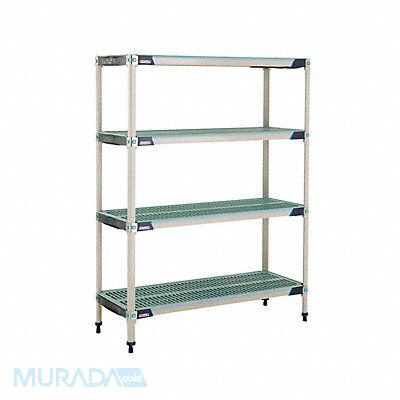 Assembled Unassembled Adjustability Adjustable Color Blue/Taupe Frame Material 304 Stainless Steel Overall Depth 48 in Overall Height 62 in Overall Width 18 in Shelf Adjustment Increments 1 in Shelf Style Ventilated Shelving Material 304 Stainless Steel Polymer Industrial Shelving Strength Rating Whole Unit Load Capacity 2 000 lb Number of Shelves 4 Mounting Type Wedge Post Clamp Load Capacity per Shelf 500 lb Antimicrobial Resistance Properties HACCP NSF Standards