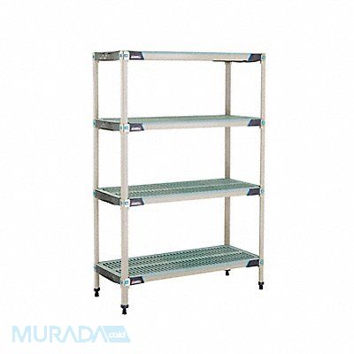 Assembled Unassembled Adjustability Adjustable Color Blue/Taupe Frame Material 304 Stainless Steel Overall Depth 42 in Overall Height 62 in Overall Width 18 in Shelf Adjustment Increments 1 in Shelf Style Ventilated Shelving Material 304 Stainless Steel Polymer Industrial Shelving Strength Rating Whole Unit Load Capacity 2 000 lb Number of Shelves 4 Mounting Type Wedge Post Clamp Load Capacity per Shelf 500 lb Antimicrobial Resistance Properties HACCP NSF Standards
