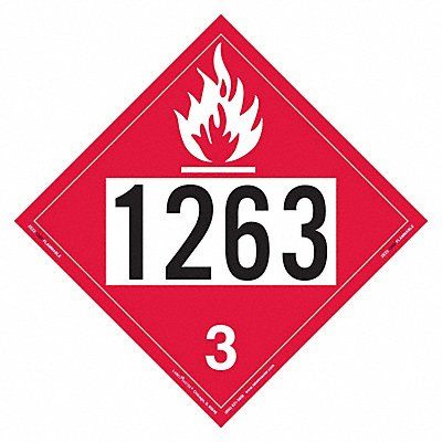 Placard Flammable Liquid UN 1263 EZ Removable Container Label/Placard Type UN Hazard Class Class 3 (Flammable Liquids) DOT/UN Product Form Placard Message 1263 Label Width 10 3/4 in Label Height 10 3/4 in Material Vinyl Package Quantity 25