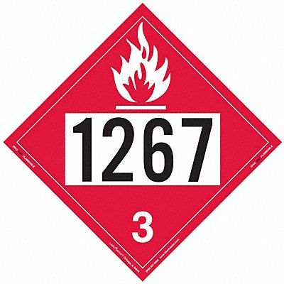 Placard Flam Liquid UN 1267 Rigid Vinyl Container Label/Placard Type UN Hazard Class Class 3 (Flammable Liquids) DOT/UN Product Form Placard Message 1267 Label Width 10 3/4 in Label Height 10 3/4 in Material Vinyl Package Quantity 25