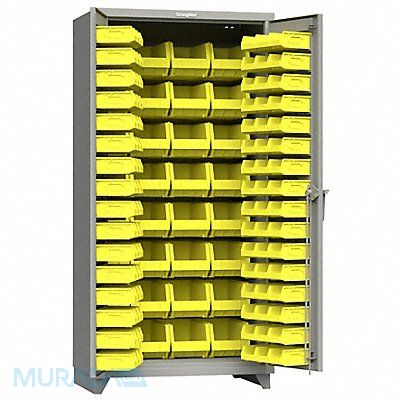 Bin Cabinet Base Type Legs Bin Color Yellow Bin HxWxD (94) 3 in x 4 1/8 in x 7 3/8 in (32) 7 in x 8 1/4 in x 14 3/4 in Cabinet Color Medium Gray Cabinet Storage Components Bins Door Type Flush Frame Assembled Assembled Mobility Stationary Number of Bins 126 Number of Cabinet Bins 32 Number of Door Bins 94 Number of Shelves 0 Overall Depth 24 in Overall Height 75 in Overall Width 36 in Bin Depth 7 3/8 in 14 3/4 in Bin Height 3 in 7 in Bin Material Polypropylene