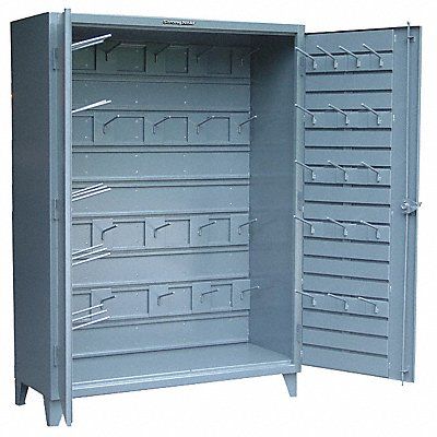 Storage Cabinet Base Type Legs Frame Assembled Assembled Cabinet Storage Components Hanging Hooks Hanger Type Hook Overall Depth 24 in Overall Height 84 in Overall Width 60 in Adjustable Hangers Yes Number of Hangers 52 Number of Doors 2 Panel Material Thickness 12 ga Cabinet Color Gray Cabinet Finish Baked Enamel Cabinet Material Steel Door Handle Type Swing Door Locking Points 3 Door Type Solid Duty Rating Super Duty Leg Height 6 in Leg Material Thickness 7 ga