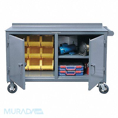 Mobile Cabinet Workbench Top Material Steel Color Gray Non-Metal Top Thickness Not Applicable Number of Doors 2 Number of Drawers 0 Number of Shelves 1 Overall Depth 30 in Overall Height 39 in Overall Load Capacity 4 800 lb Overall Width 60 in Top Metal Material Gauge 7 ga Included Components Handle on Side Lower Shelf Assembly Fully Assembled Caster Type (2) Rigid (2) Swivel with Brakes Door Type Standard/Hinged Foot Type Caster Frame Material Steel
