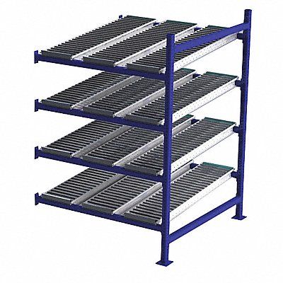 Gravity Flow Rack 1 000 lb Load Capacity per Shelf Tilted Shelf Angle 14 ga Shelf Gauge Add-On Shelving Configuration Number of Shelves 4 Decking Finish Powder Coated Decking Material Steel Roller Track Decking Style Depth per Side 48 in Powder Coated Steel Blue Overall Depth 48 in Overall Height 72 in Overall Width 48 in 12 ga Post Gauge 4 000 lb Whole Unit Load Capacity Assembled Unassembled Labels Post Caps Touch Up Marker Bolt-Together