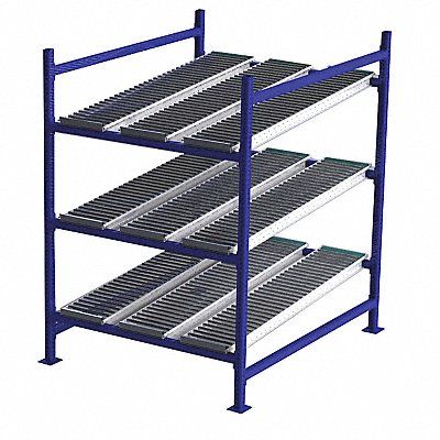 Gravity Flow Rack 1 000 lb Load Capacity per Shelf Tilted Shelf Angle 14 ga Shelf Gauge Starter Shelving Configuration Number of Shelves 3 Decking Finish Powder Coated Decking Material Steel Roller Track Decking Style Depth per Side 60 in Powder Coated Steel Blue Overall Depth 60 in Overall Height 72 in Overall Width 48 in 12 ga Post Gauge 3 000 lb Whole Unit Load Capacity Assembled Unassembled Labels Post Caps Touch Up Marker Bolt-Together