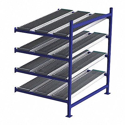 Gravity Flow Rack 1 000 lb Load Capacity per Shelf Tilted Shelf Angle 14 ga Shelf Gauge Add-On Shelving Configuration Number of Shelves 4 Decking Finish Powder Coated Decking Material Steel Roller Track Decking Style Depth per Side 60 in Powder Coated Steel Blue Overall Depth 60 in Overall Height 72 in Overall Width 48 in 12 ga Post Gauge 4 000 lb Whole Unit Load Capacity Assembled Unassembled Labels Post Caps Touch Up Marker Bolt-Together