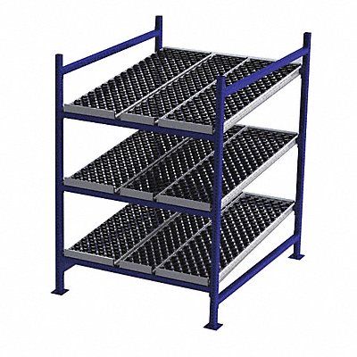 Gravity Flow Rack 1 000 lb Load Capacity per Shelf Tilted Shelf Angle 14 ga Shelf Gauge Starter Shelving Configuration Number of Shelves 3 Decking Finish Powder Coated Decking Material Rubber Skate Wheel Track Decking Style Depth per Side 60 in Powder Coated Steel Blue Overall Depth 60 in Overall Height 72 in Overall Width 48 in 12 ga Post Gauge 3 000 lb Whole Unit Load Capacity Assembled Unassembled Labels Post Caps Touch Up Marker Bolt-Together