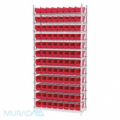 D5527 Bin Shelving Bin Style Shelf Bin Material Polymer (96) 4 in x 4 1/8 in x 11 5/8 in Bin HxWxD Bin Height 4 in Bin Front Type Open Bin Depth 11 5/8 in Bin Color Red Frame Material Steel NSF Frame Color Silver Chrome Includes Bins Yes Bin Width 4 1/8 in Includes 30120 Load Capacity per Shelf 160 lb Mobility Stationary Number of Bins 96 Number of Shelves 12 Number of Usable Sides 1 Overall Depth 14 in Overall Height 74 in Overall Width 36 in Chrome Shelf Finish
