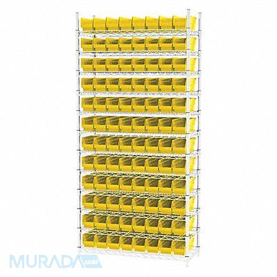 D5527 Bin Shelving Bin Style Shelf Bin Material Polymer (96) 4 in x 4 1/8 in x 11 5/8 in Bin HxWxD Bin Height 4 in Bin Front Type Open Bin Depth 11 5/8 in Bin Color Yellow Frame Material Steel NSF Frame Color Silver Chrome Includes Bins Yes Bin Width 4 1/8 in Includes 30120 Load Capacity per Shelf 160 lb Mobility Stationary Number of Bins 96 Number of Shelves 12 Number of Usable Sides 1 Overall Depth 14 in Overall Height 74 in Overall Width 36 in Chrome Shelf Finish