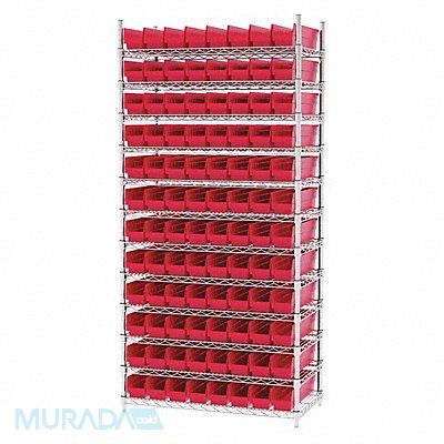 D5529 Bin Shelving Bin Style Shelf Bin Material Polymer (96) 4 in x 4 1/8 in x 17 7/8 in Bin HxWxD Bin Height 4 in Bin Front Type Open Bin Depth 17 7/8 in Bin Color Red Frame Material Steel NSF Frame Color Silver Chrome Includes Bins Yes Bin Width 4 1/8 in Includes 30128 Load Capacity per Shelf 160 lb Mobility Stationary Number of Bins 96 Number of Shelves 12 Number of Usable Sides 1 Overall Depth 18 in Overall Height 74 in Overall Width 36 in Chrome Shelf Finish