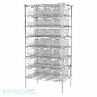 Bin Shelving Bin Style Giant Hopper Bin Material Polymer (28) 7 in x 19 7/8 in x 23 7/8 in Bin HxWxD Bin Height 7 in Bin Front Type Open Bin Depth 23 7/8 in Bin Color Clear Frame Material Steel NSF Frame Color Silver Chrome Includes Bins Yes Bin Width 19 7/8 in Includes 30284 Load Capacity per Shelf 250 lb Mobility Stationary Number of Bins 28 Number of Shelves 8 Number of Usable Sides 1 Overall Depth 24 in Overall Height 74 in Overall Width 36 in Chrome Shelf Finish