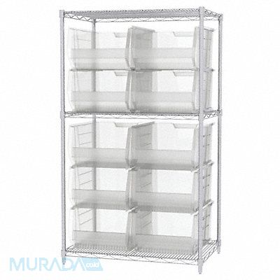 Bin Shelving Bin Style Giant Hopper Bin Material Polymer (10) 11 in x 16 1/2 in x 23 7/8 in Bin HxWxD Bin Height 11 in Bin Front Type Open Bin Depth 23 7/8 in Bin Color Clear Frame Material Steel NSF Frame Color Silver Chrome Includes Bins Yes Bin Width 16 1/2 in Includes 30288 Load Capacity per Shelf 665 lb Mobility Stationary Number of Bins 10 Number of Shelves 3 Number of Usable Sides 1 Overall Depth 24 in Overall Height 74 in Overall Width 36 in Chrome Shelf Finish