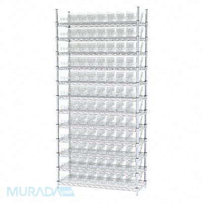 D5527 Bin Shelving Bin Style Shelf Bin Material Polymer (96) 4 in x 4 1/8 in x 11 5/8 in Bin HxWxD Bin Height 4 in Bin Front Type Open Bin Depth 11 5/8 in Bin Color Clear Frame Material Steel NSF Frame Color Silver Chrome Includes Bins Yes Bin Width 4 1/8 in Includes 30120 Load Capacity per Shelf 160 lb Mobility Stationary Number of Bins 96 Number of Shelves 12 Number of Usable Sides 1 Overall Depth 14 in Overall Height 74 in Overall Width 36 in Chrome Shelf Finish