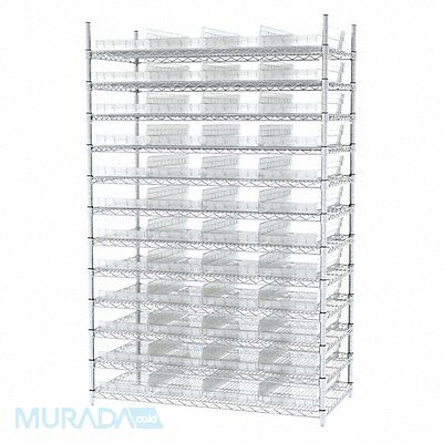 Bin Shelving Bin Style Shelf Bin Material Polymer (48) 4 in x 11 1/8 in x 23 5/8 in Bin HxWxD Bin Height 4 in Bin Front Type Open Bin Depth 23 5/8 in Bin Color Clear Frame Material Steel NSF Frame Color Silver Chrome Includes Bins Yes Bin Width 11 1/8 in Includes 30174 Load Capacity per Shelf 160 lb Mobility Stationary Number of Bins 48 Number of Shelves 12 Number of Usable Sides 1 Overall Depth 24 in Overall Height 74 in Overall Width 48 in Chrome Shelf Finish