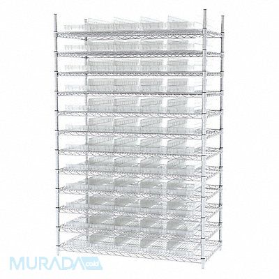 Bin Shelving Bin Style Shelf Bin Material Polymer (60) 4 in x 8 7/8 in x 23 5/8 in Bin HxWxD Bin Height 4 in Bin Front Type Open Bin Depth 23 5/8 in Bin Color Clear Frame Material Steel NSF Frame Color Silver Chrome Includes Bins Yes Bin Width 8 7/8 in Includes 30184 Load Capacity per Shelf 160 lb Mobility Stationary Number of Bins 60 Number of Shelves 12 Number of Usable Sides 1 Overall Depth 24 in Overall Height 74 in Overall Width 48 in Chrome Shelf Finish