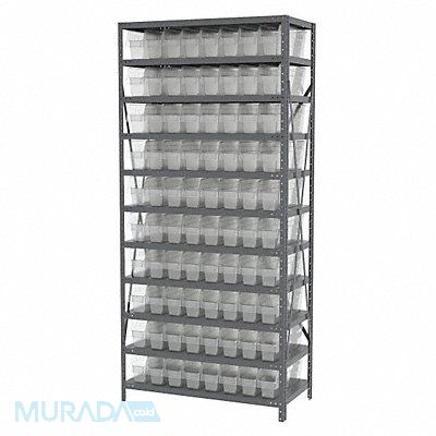 Bin Shelving Bin Style Shelf Bin Material Polymer (80) 6 in x 4 1/8 in x 17 7/8 in Bin HxWxD Bin Height 6 in Bin Front Type Open Bin Depth 17 7/8 in Bin Color Clear Frame Material Steel Frame Color Gray Powder Coated Includes Bins Yes Bin Width 4 1/8 in Includes 30048 Load Capacity per Shelf 550 lb Mobility Stationary Number of Bins 80 Number of Shelves 11 Number of Usable Sides 1 Overall Depth 18 in Overall Height 79 in Overall Width 36 in Powder Coated Shelf Finish