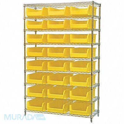 D5362 Bin Shelving Bin Style Giant Hopper Bin Material Polymer (24) 6 in x 12 3/8 in x 20 in Bin HxWxD Bin Height 6 in Bin Front Type Open Bin Depth 20 in Bin Color Yellow Frame Material Steel NSF Frame Color Silver Chrome Includes Bins Yes Bin Width 12 3/8 in Includes 30280 Load Capacity per Shelf 220 lb Mobility Stationary Number of Bins 24 Number of Shelves 9 Number of Usable Sides 1 Overall Depth 18 in Overall Height 74 in Overall Width 48 in Chrome Shelf Finish