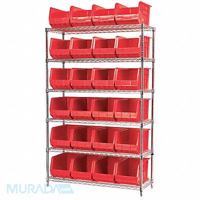 D5366 Bin Shelving Bin Style Hang and Stack Bin Material Polymer (24) 10 in x 11 in x 18 in Bin HxWxD Bin Height 10 in Bin Front Type Open Bin Depth 18 in Bin Color Red Frame Material Steel NSF Frame Color Silver Chrome Includes Bins Yes Bin Width 11 in Includes 30260 Load Capacity per Shelf 330 lb Mobility Stationary Number of Bins 24 Number of Shelves 6 Number of Usable Sides 1 Overall Depth 18 in Overall Height 74 in Overall Width 48 in Chrome Shelf Finish