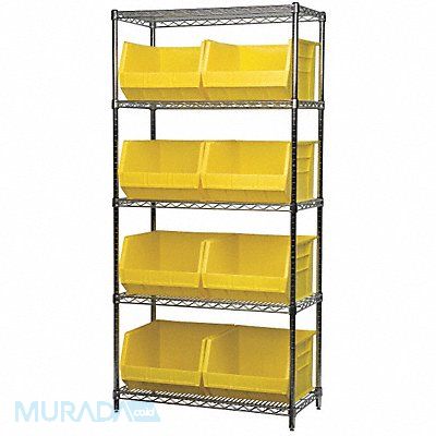 D5367 Bin Shelving Bin Style Hang and Stack Bin Material Polymer (9) 11 in x 16 1/2 in x 18 in Bin HxWxD Bin Height 11 in Bin Front Type Open Bin Depth 18 in Bin Color Yellow Frame Material Steel NSF Frame Color Silver Chrome Includes Bins Yes Bin Width 16 1/2 in Includes 30270 Load Capacity per Shelf 400 lb Mobility Stationary Number of Bins 9 Number of Shelves 5 Number of Usable Sides 1 Overall Depth 18 in Overall Height 74 in Overall Width 36 in Chrome Shelf Finish