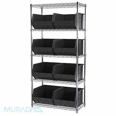 D5367 Bin Shelving Bin Style Hang and Stack Bin Material Polymer (9) 11 in x 16 1/2 in x 18 in Bin HxWxD Bin Height 11 in Bin Front Type Open Bin Depth 18 in Bin Color Black Frame Material Steel NSF Frame Color Silver Chrome Includes Bins Yes Bin Width 16 1/2 in Includes 30270 Load Capacity per Shelf 400 lb Mobility Stationary Number of Bins 9 Number of Shelves 5 Number of Usable Sides 1 Overall Depth 18 in Overall Height 74 in Overall Width 36 in Chrome Shelf Finish