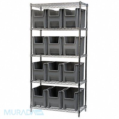 G3472 Bin Shelving Bin Style Stacking Bin Material Polymer (12) 12 1/2 in x 10 7/8 in x 17 1/2 in Bin HxWxD Bin Height 12 1/2 in Bin Front Type Open Bin Depth 17 1/2 in Bin Color Gray Frame Material Steel NSF Frame Color Silver Chrome Includes Bins Yes Bin Width 10 7/8 in Includes 13014 Load Capacity per Shelf 400 lb Mobility Stationary Number of Bins 12 Number of Shelves 5 Number of Usable Sides 1 Overall Depth 18 in Overall Height 74 in Overall Width 36 in Chrome Shelf Finish