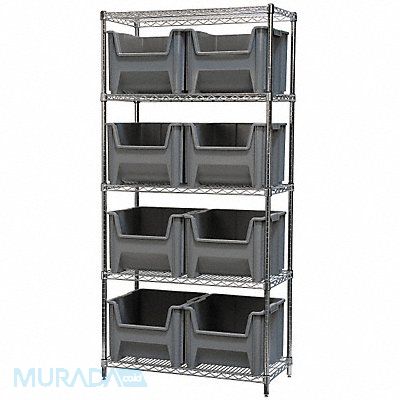 G3473 Bin Shelving Bin Style Stacking Bin Material Polymer (8) 12 1/2 in x 16 1/2 in x 17 1/2 in Bin HxWxD Bin Height 12 1/2 in Bin Front Type Open Bin Depth 17 1/2 in Bin Color Gray Frame Material Steel NSF Frame Color Silver Chrome Includes Bins Yes Bin Width 16 1/2 in Includes 13018 Load Capacity per Shelf 400 lb Mobility Stationary Number of Bins 8 Number of Shelves 5 Number of Usable Sides 1 Overall Depth 18 in Overall Height 74 in Overall Width 36 in Chrome Shelf Finish