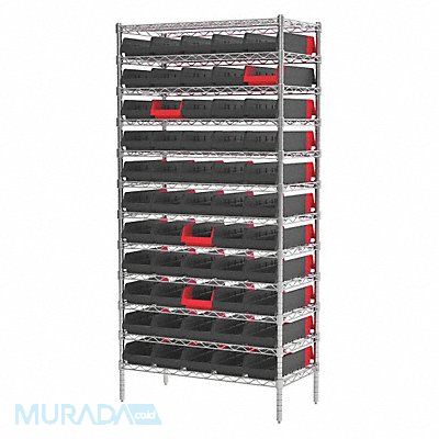 K6934 Bin Shelving Bin Style Indicator Bin Material Polymer (60) 4 in x 6 5/8 in x 17 7/8 in Bin HxWxD Bin Height 4 in Bin Front Type Open Bin Depth 17 7/8 in Bin Color Black Red Frame Material Steel NSF Frame Color Silver Chrome Includes Bins Yes Bin Width 6 5/8 in Includes 36448 Load Capacity per Shelf 550 lb Mobility Stationary Number of Bins 60 Number of Shelves 12 Number of Usable Sides 1 Overall Depth 18 in Overall Height 74 in Overall Width 36 in Chrome Shelf Finish