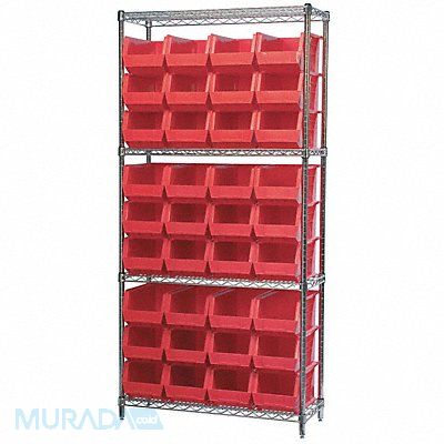 D5519 Bin Shelving Bin Style Hang and Stack Bin Material Polymer (36) 7 in x 8 1/4 in x 14 3/4 in Bin HxWxD Bin Height 7 in Bin Front Type Open Bin Depth 14 3/4 in Bin Color Red Frame Material Steel NSF Frame Color Silver Chrome Includes Bins Yes Bin Width 8 1/4 in Includes 30240 Load Capacity per Shelf 500 lb Mobility Stationary Number of Bins 36 Number of Shelves 4 Number of Usable Sides 1 Overall Depth 14 in Overall Height 74 in Overall Width 36 in Chrome Shelf Finish