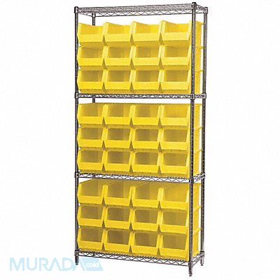 D5519 Bin Shelving Bin Style Hang and Stack Bin Material Polymer (36) 7 in x 8 1/4 in x 14 3/4 in Bin HxWxD Bin Height 7 in Bin Front Type Open Bin Depth 14 3/4 in Bin Color Yellow Frame Material Steel NSF Frame Color Silver Chrome Includes Bins Yes Bin Width 8 1/4 in Includes 30240 Load Capacity per Shelf 500 lb Mobility Stationary Number of Bins 36 Number of Shelves 4 Number of Usable Sides 1 Overall Depth 14 in Overall Height 74 in Overall Width 36 in Chrome Shelf Finish